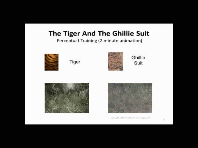 Perceptual Training is a growing component in improving a soldier’s ability to identify subtle environmental changes in a combat environment and being able to quickly adapt. In essence, it helps prepare soldiers for one of the most basic concepts of combat – recognition and utilization of camouflage and deception. TransLumen has the ability to present a visual scenario that seems static, but actually changes subtly to reveal various situational threats. For example, the image in the upper-left of this page could appear safe, but the area marked with the red square in that image is actually the location of a sniper. This type of testing/training is important because: